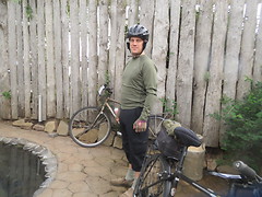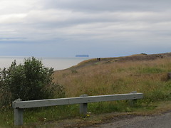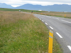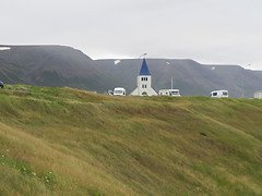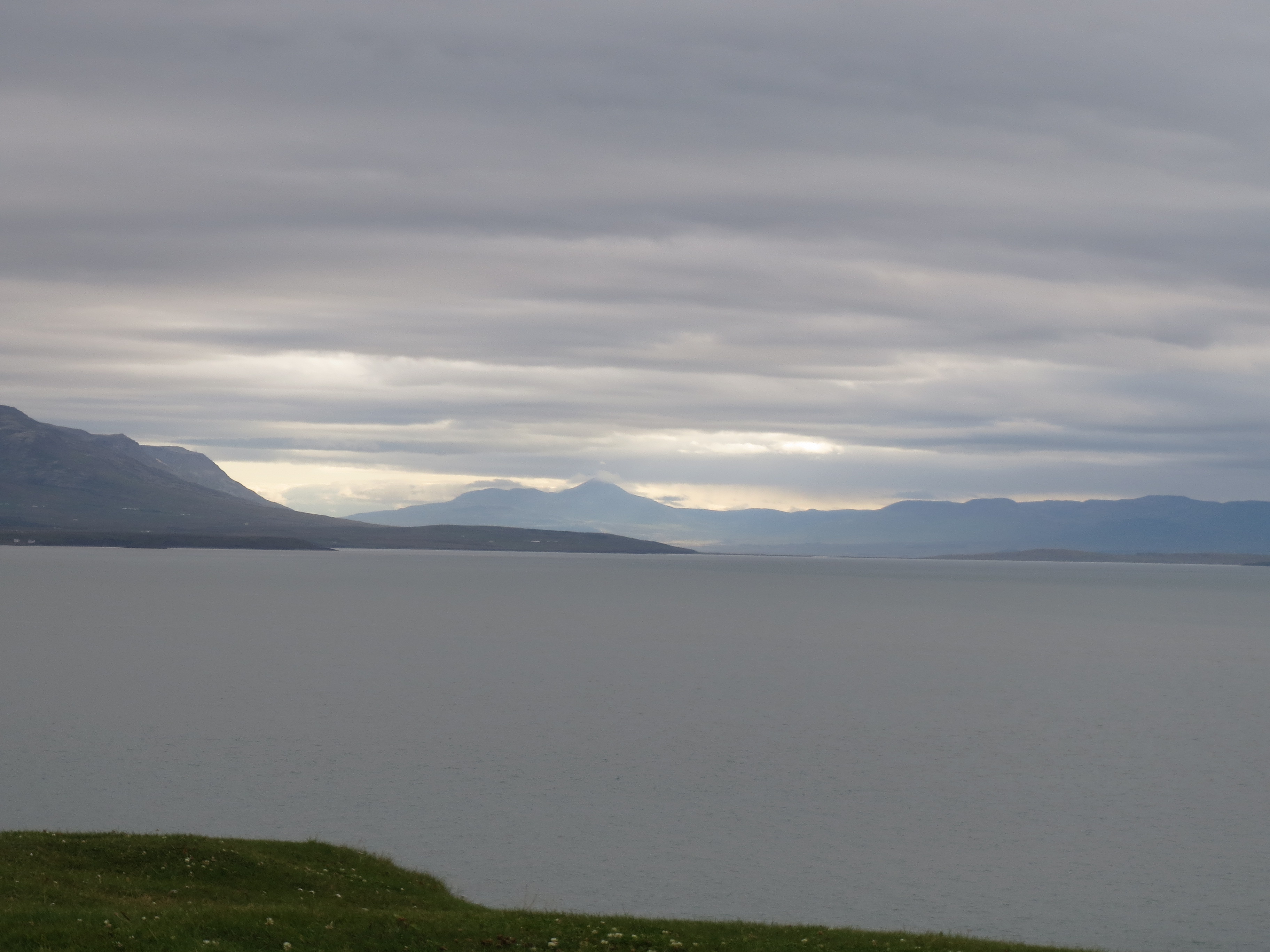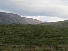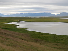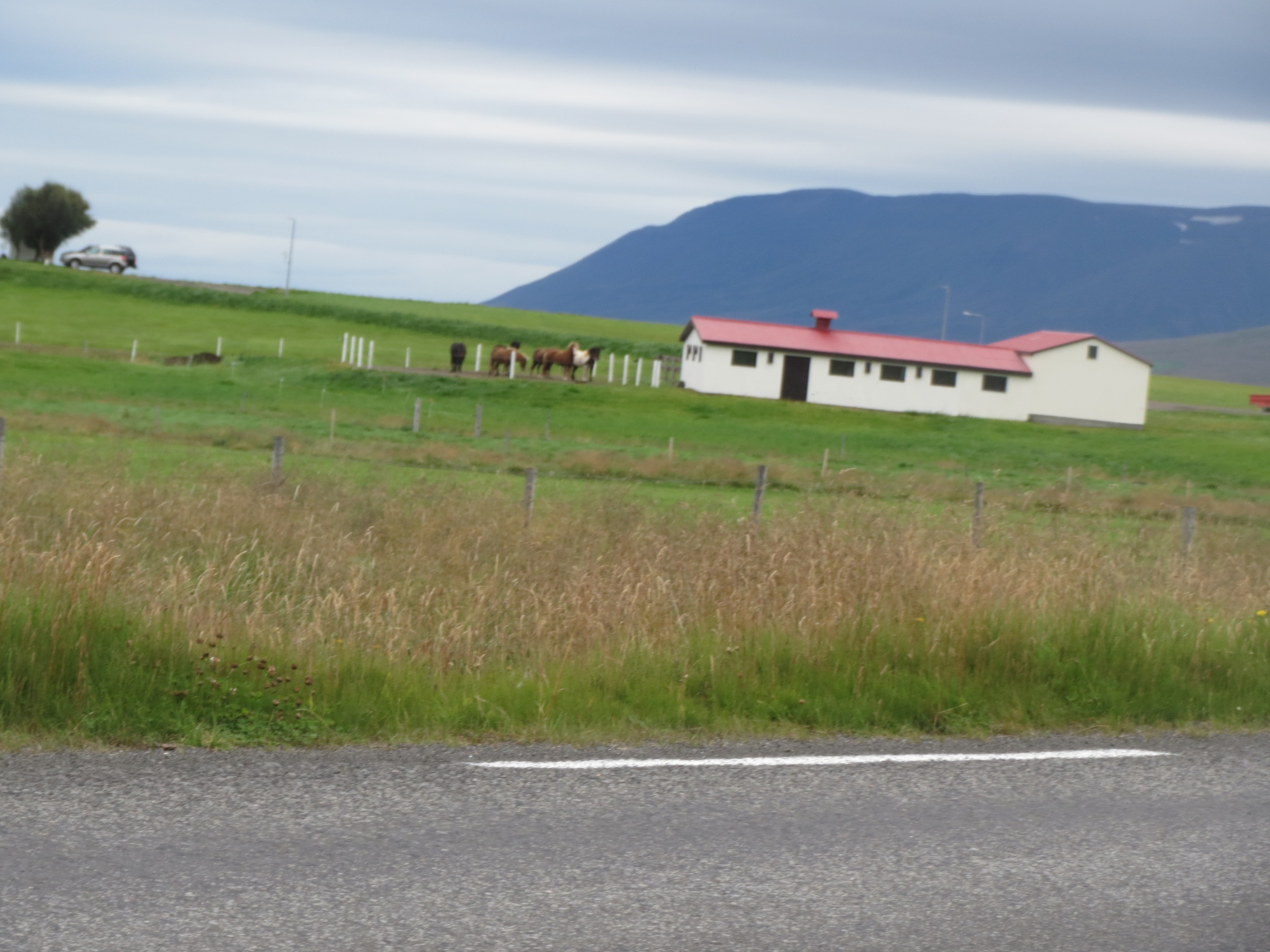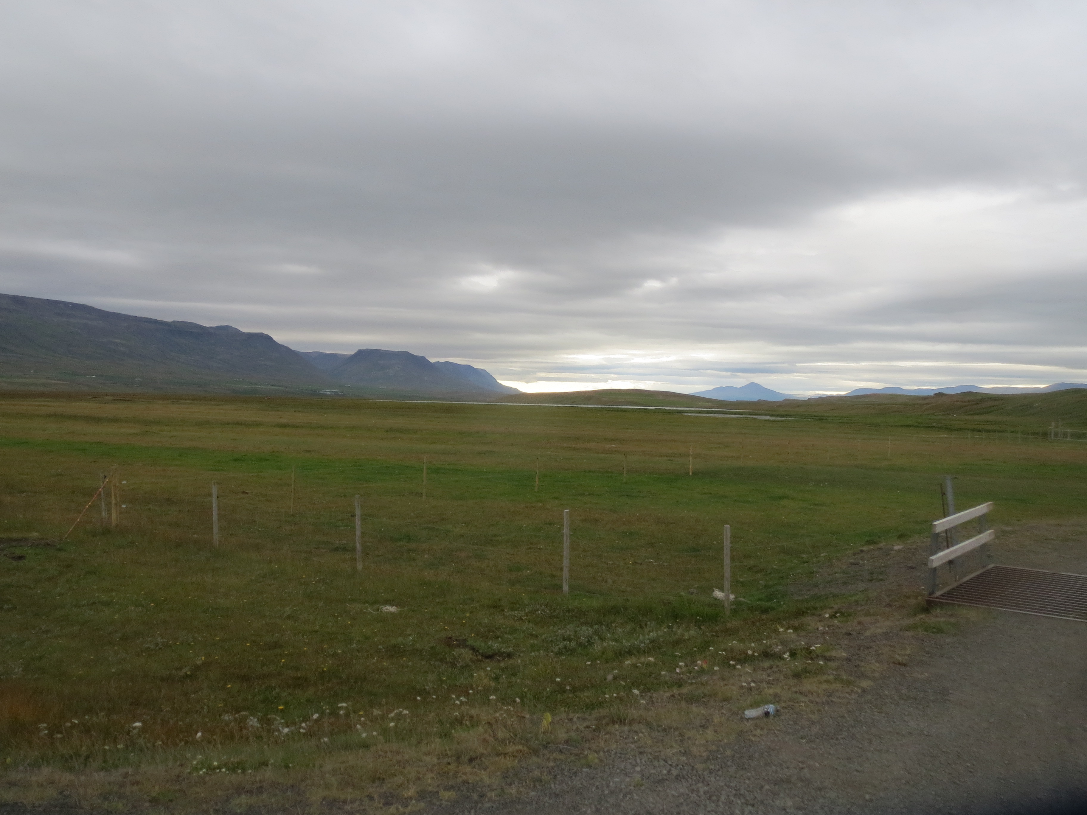 Sauðárkrókur to Hofsós (57km): First day of riding! We biked together all day, from Sauðárkrókur across the valley at the base of the fjord, and then inland to our lunch stop at Hólar, where we encountered more sod houses and other interesting features. We drove up the coast to Hofsós, which should have been our stop for the night, but it didn't have a hotel big enough for the group. So instead we went to an outdoor swimming pool and hot tub, and looked at the basalt cliffs, after which Will met us with the van and drove us back to our hotel in Sauðárkrókur. Dinner was a reasonable but random fusion restaurant, followed by some board games back at the hotel.