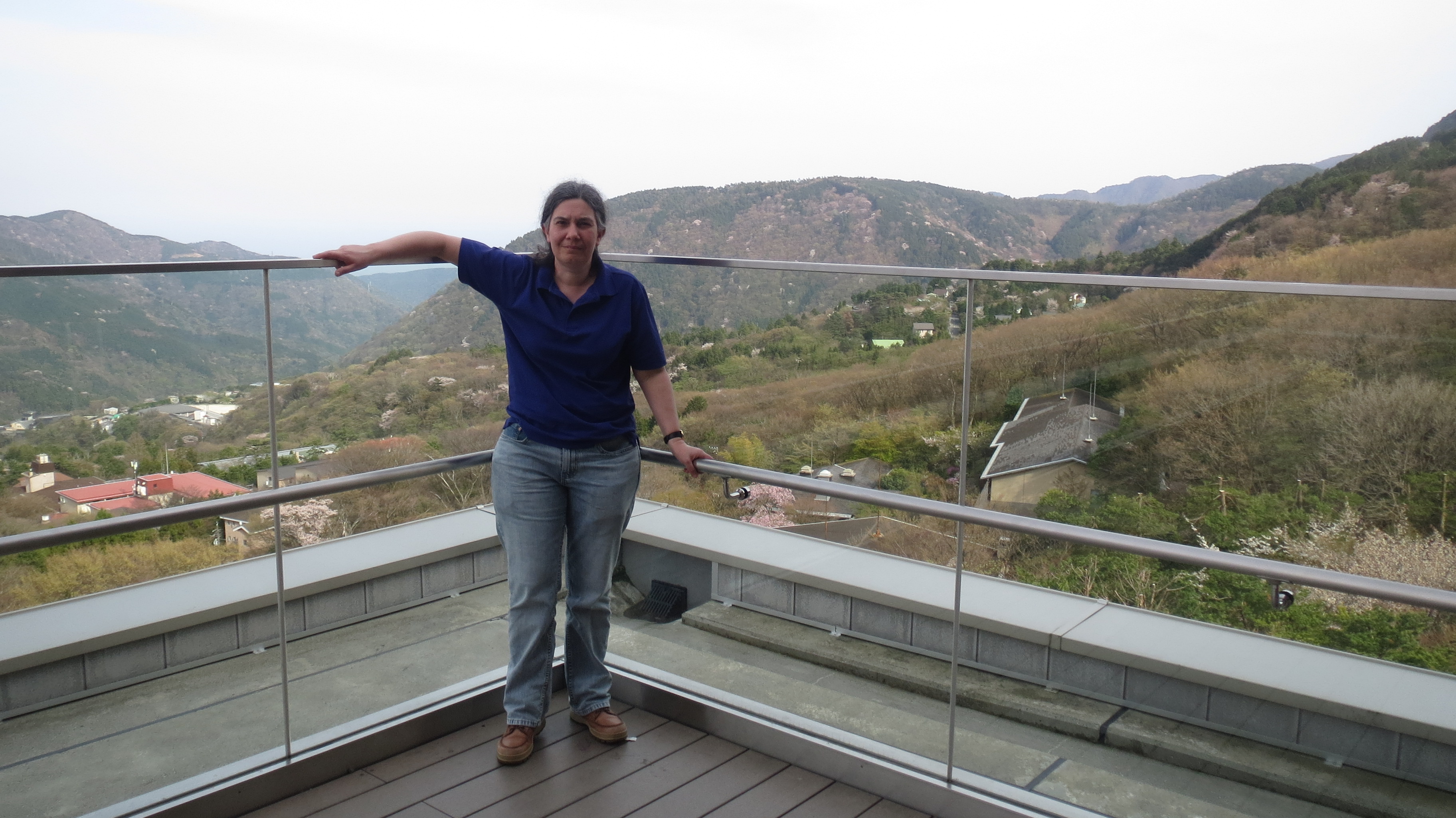 Tokyo to Hakone (by subway, scenic train, mountain train, cable car, and ropeway): Catherine, Gina, and i embarked on an extremely touristy scenic adventure, carrying an unwieldy amount of luggage. The Tokyo-Hakone adventure route is a well-trodden path by which you take a scenic train called the Romancecar southwest into the mountain range west of Tokyo, then climb over Mount Hakone via an increasingly-improbable string of other types of train. We arrived at the lake and had a short walk to our resort hotel, Hanaori, whose lake views were not exaggerated. We sat on the porch and ate and enjoyed the fresh mochi we'd picked up at our lunch stop, put our feet in the foot bath on the hotel deck, then had dinner at the hotel buffet and called it a night.