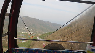 an epic shot of cable cars, trees, mountains, and Mount Fuji, foiled by late afternoon glare |