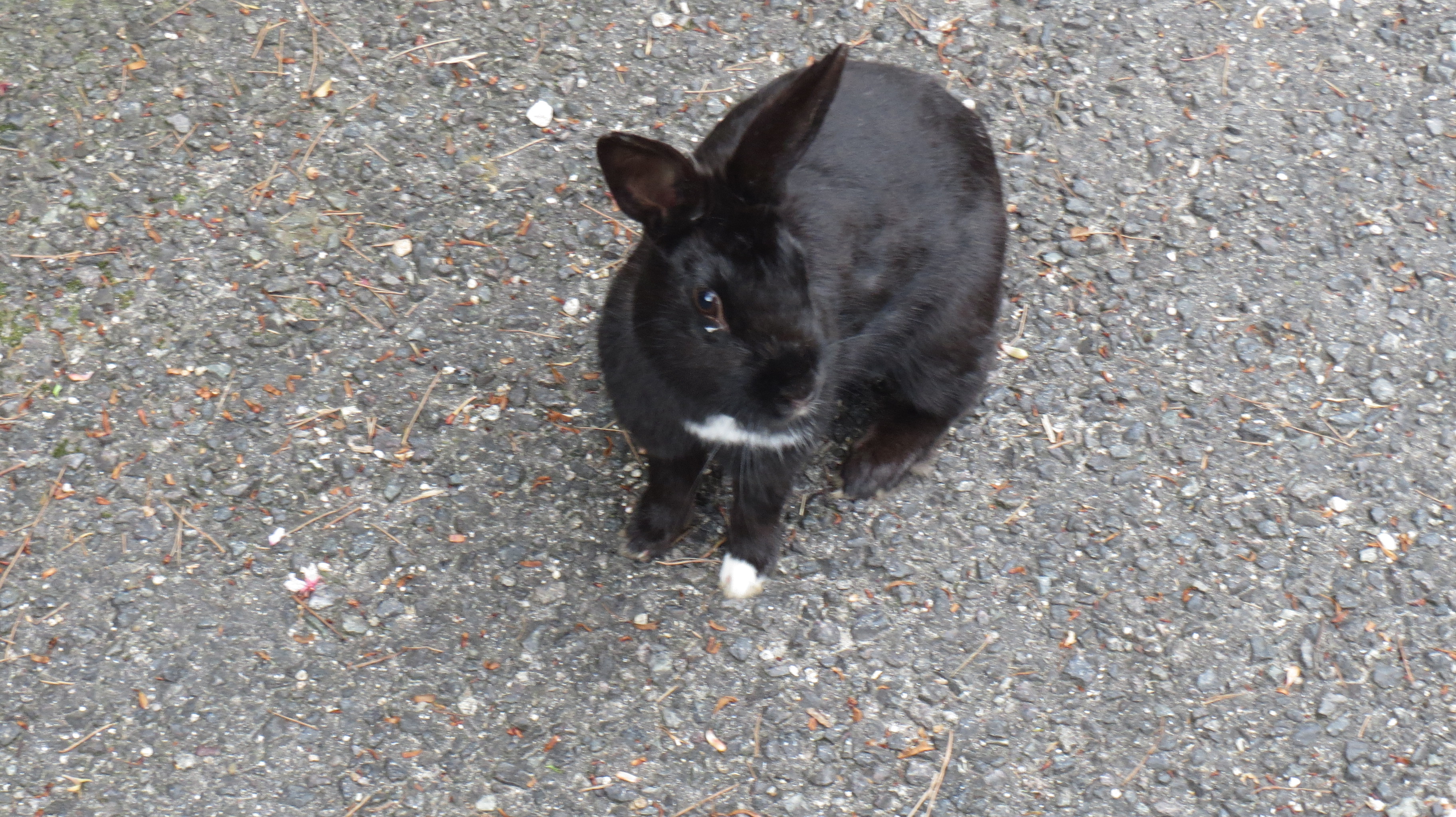 stones next to the dock at Okunoshima, where we are immediately greeted by a rabbit |