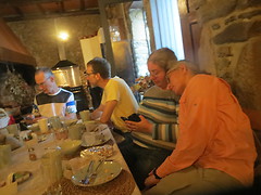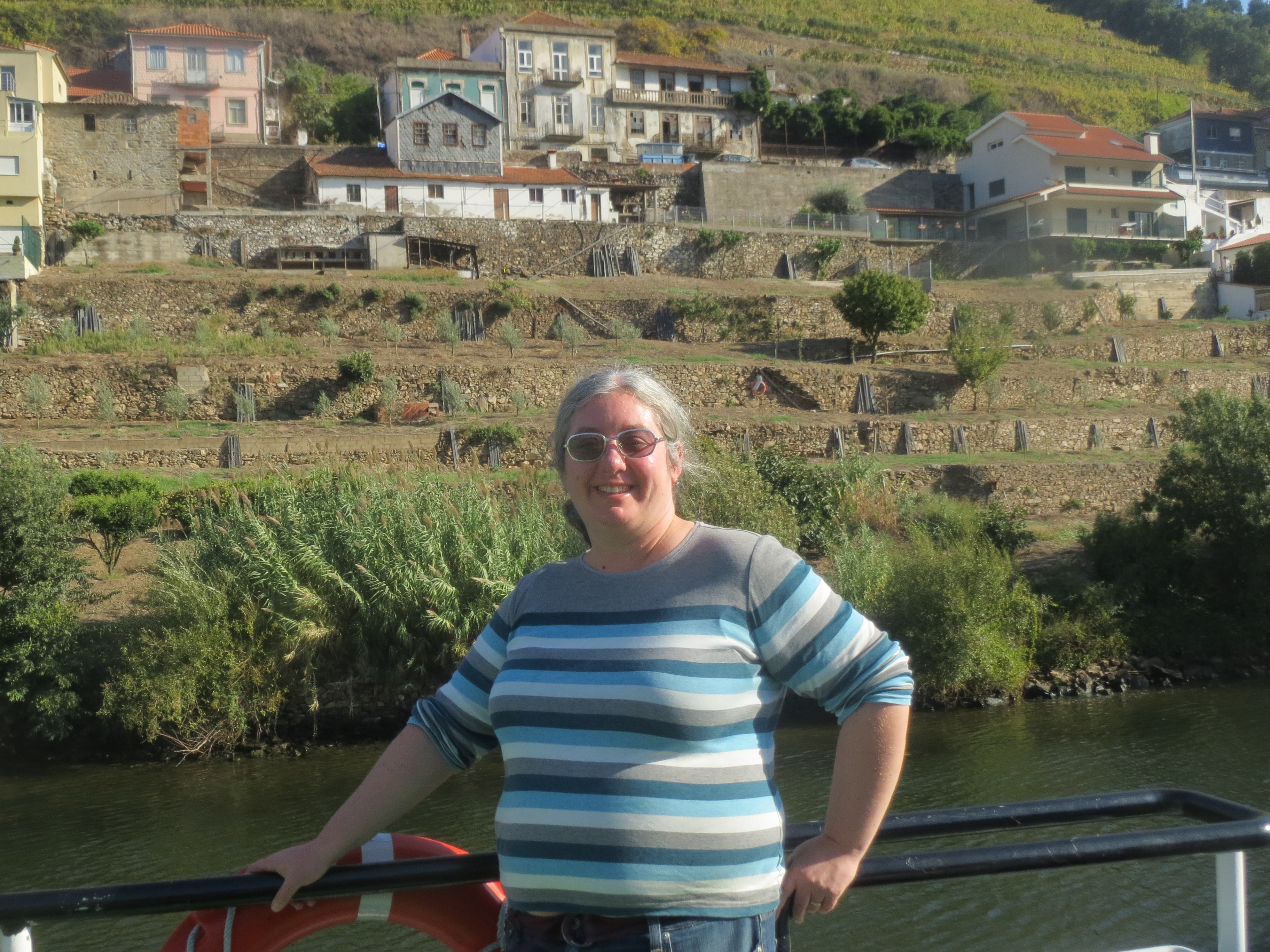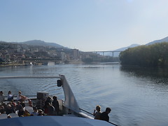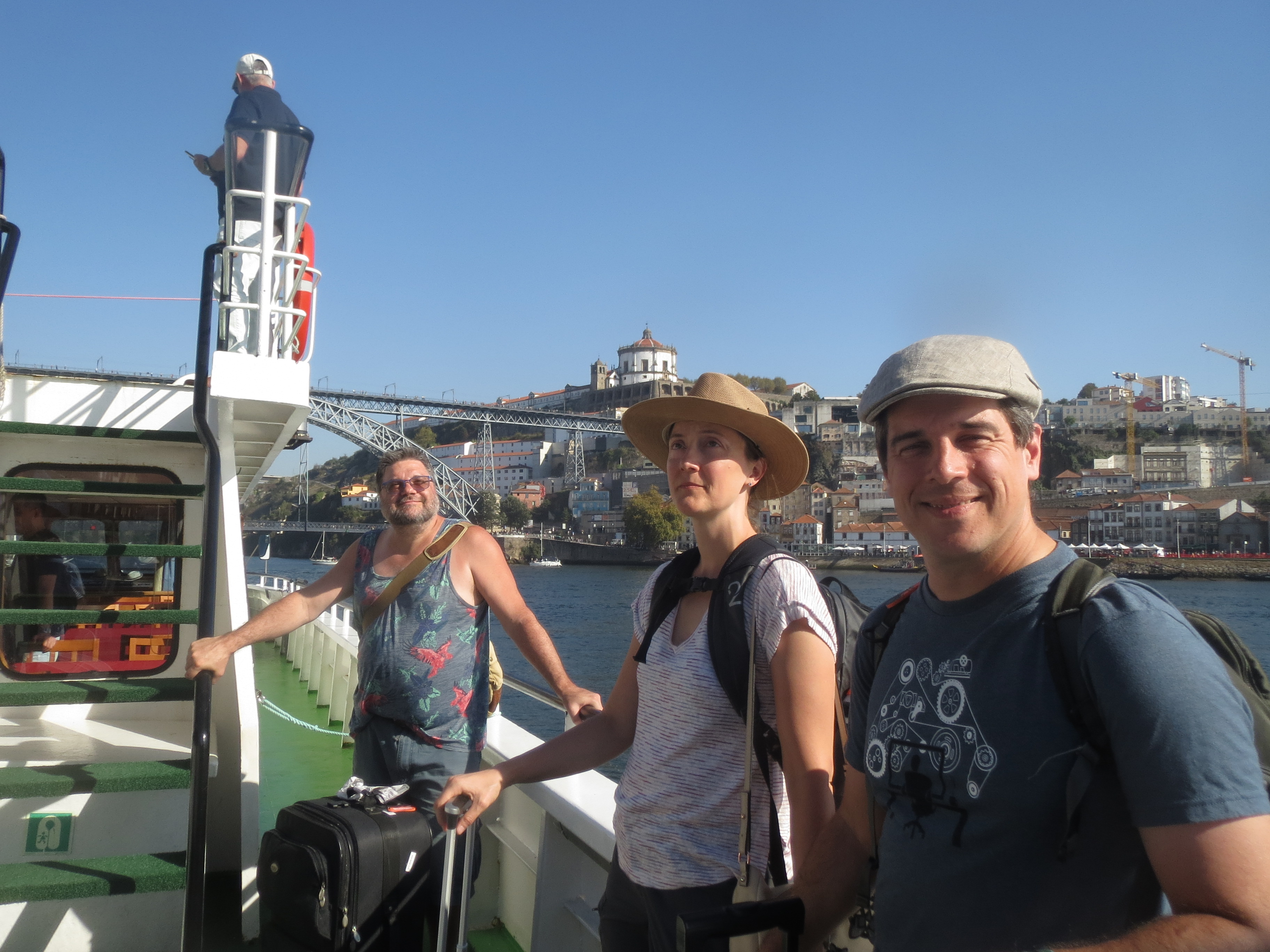 Peso da Régua to Porto by boat: in the morning, we said goodbye to Sonia and Pedro, as well as David, Tom, Joe, and Emily, and the remaining seven of us took the Rota do Duoro river cruise back to Porto. The scenery was creat; it was neat to see things from the river, and we made great time going through two locks, arriving in Porto around 16:00. The boat was reasonable comfort-wise --- the sun was hot, and the indoor spaces weren't always air conditioned, but a lot of it was comfortable, the food was fine, and it was nice to relax and play some board games and look at the views.