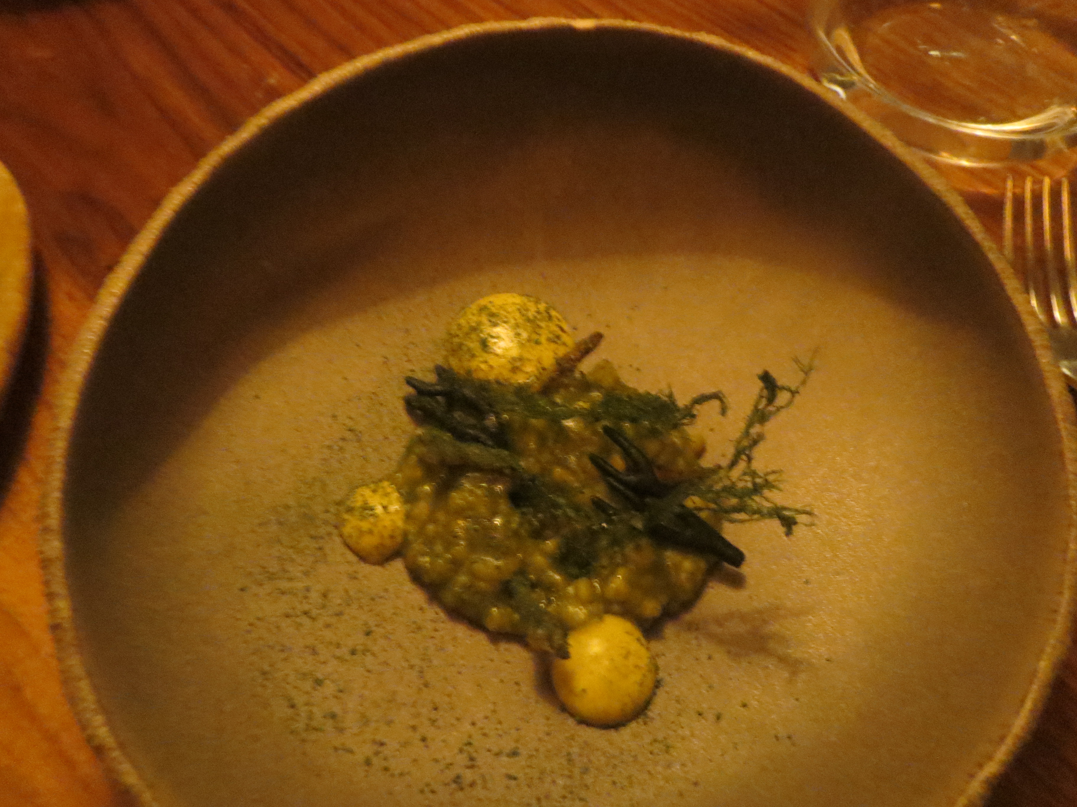 first moment: carrot tartlet with tonburi, white beans with avocado, eggplant azevia, satay peanut, gold hummus egg |