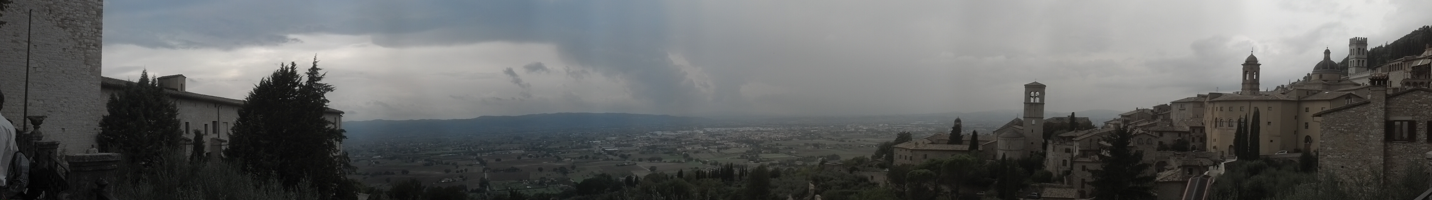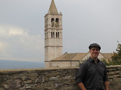 Scott, David, Tom, and i had a (relatively) early morning. After breakfast at the hotel buffet (featuring excellent whole wheat croissants), we hit the road by 8:45. We started with a terrific, if chilly, ride down to the valley floor (i maxed out at 46kph), then stopped briefly in Umbertide to take pictures. Apparently sometimes this tour puts the hotel stop in Umbertide rather than Montone — we felt we'd lucked out, given the gorgeous views, neat town, and great food in Montone. After that, we rode along the Tiber for awhile, then stopped for an early lunch of mediocre panini (egg and tuna) after about 20 km. We rode through the valley and then climbed to Assisi, arriving in mid-afternoon. Scott and i spent the rest of the afternoon wandering around Assisi, which was totally charming in the rain. In lieu of dinner out, we had pizza at the hotel, and played Citadels and Swedish Goat Game.