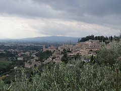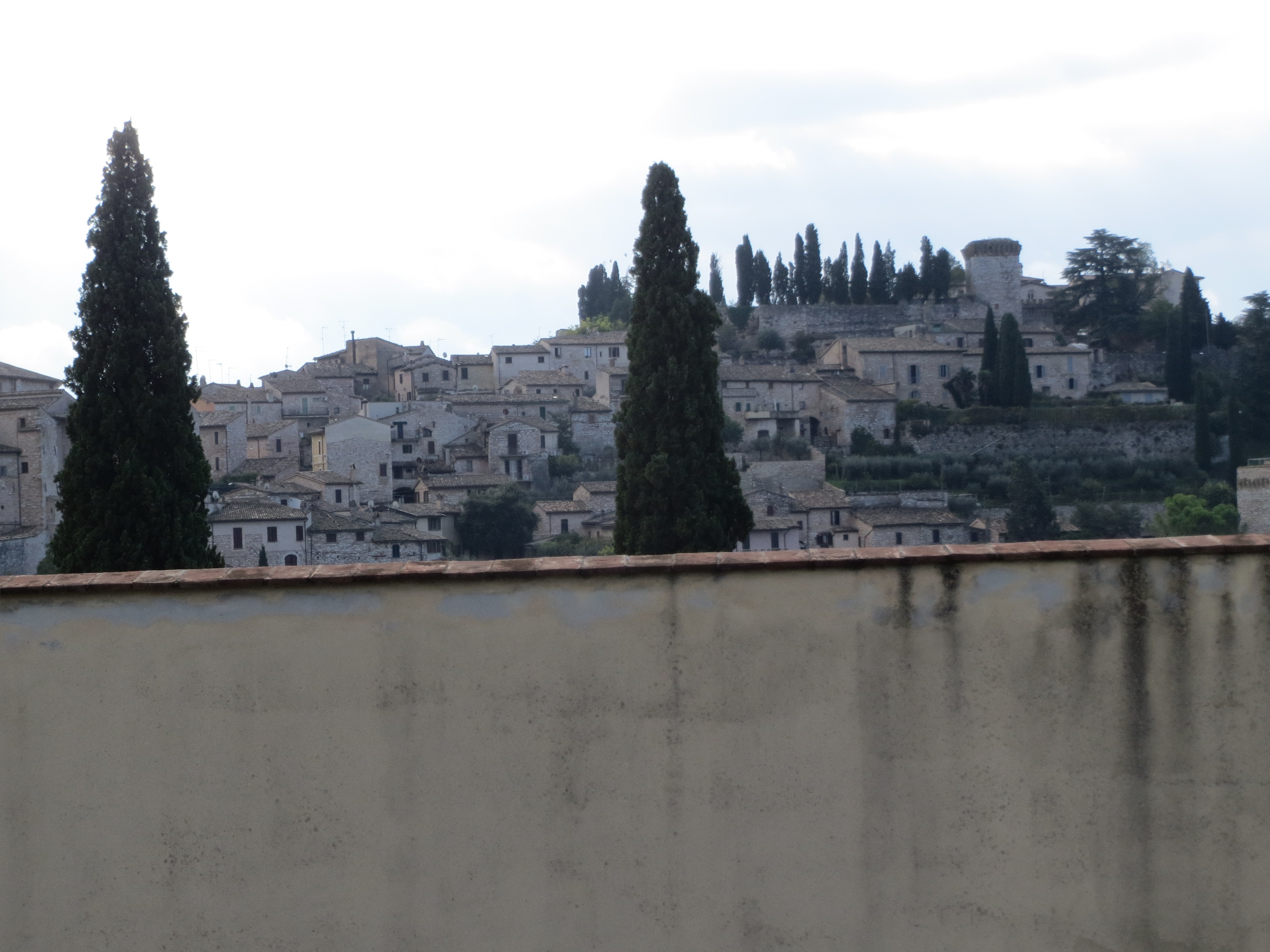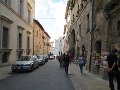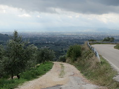 I kept a lot of pictures from today — apologies in advance. I was really charmed by Assisi and by the views from the day's route. BDan, Scott, and i did the loop ride around Mount Subasio. We got a slow start. The highlight of breakfast was do-it-yourself caffe latte (a pitcher of coffee and a pitcher of excellent fresh milk on each table), and with one thing and another, it was 9:45 by the time we were underway. We then rode down to Spello, up around the mountain, and back down again. The day was not free of incident, but the views were gorgeous and we were pleased with ourselves for making the ride. We got back at around 16:20, then headed to the Basilica of St. Francis. After sunset, we had a nice dinner in town, in which i shared 'local long pasta' (not unlike udon) with walnuts and arugala and a rabbit dish, and, for dessert, panna cotta and more biscotti, soaked in a not-overly-sweet red wine this time.